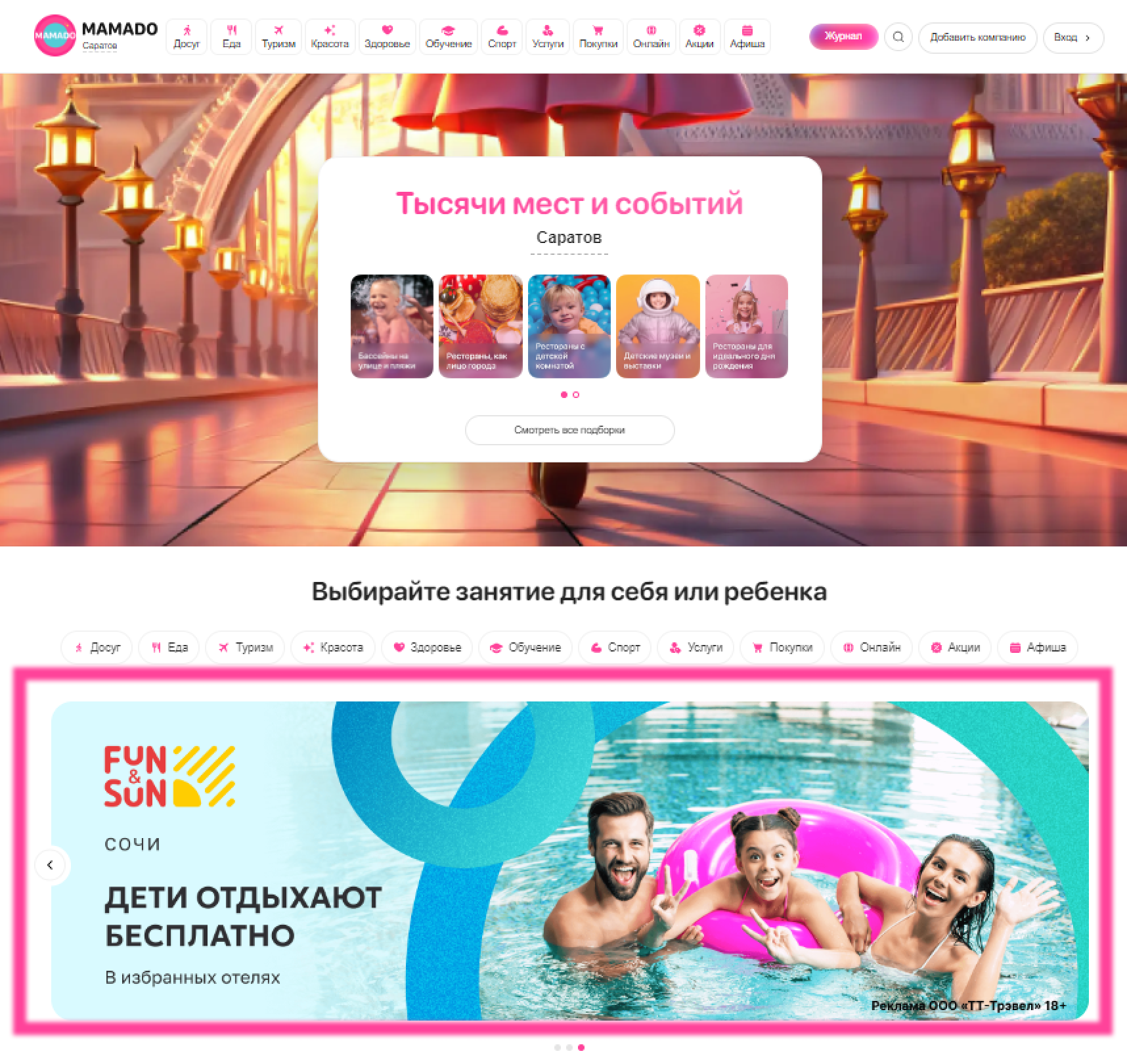 Можно выбрать любой раздел для размещения статичного баннера: главная страница, страница категорий, афиши, акций. В блок статичного баннера мы добавляем не более 5 мест в ротацию. Можно также проговорить условия индивидуального размещения без ротации.